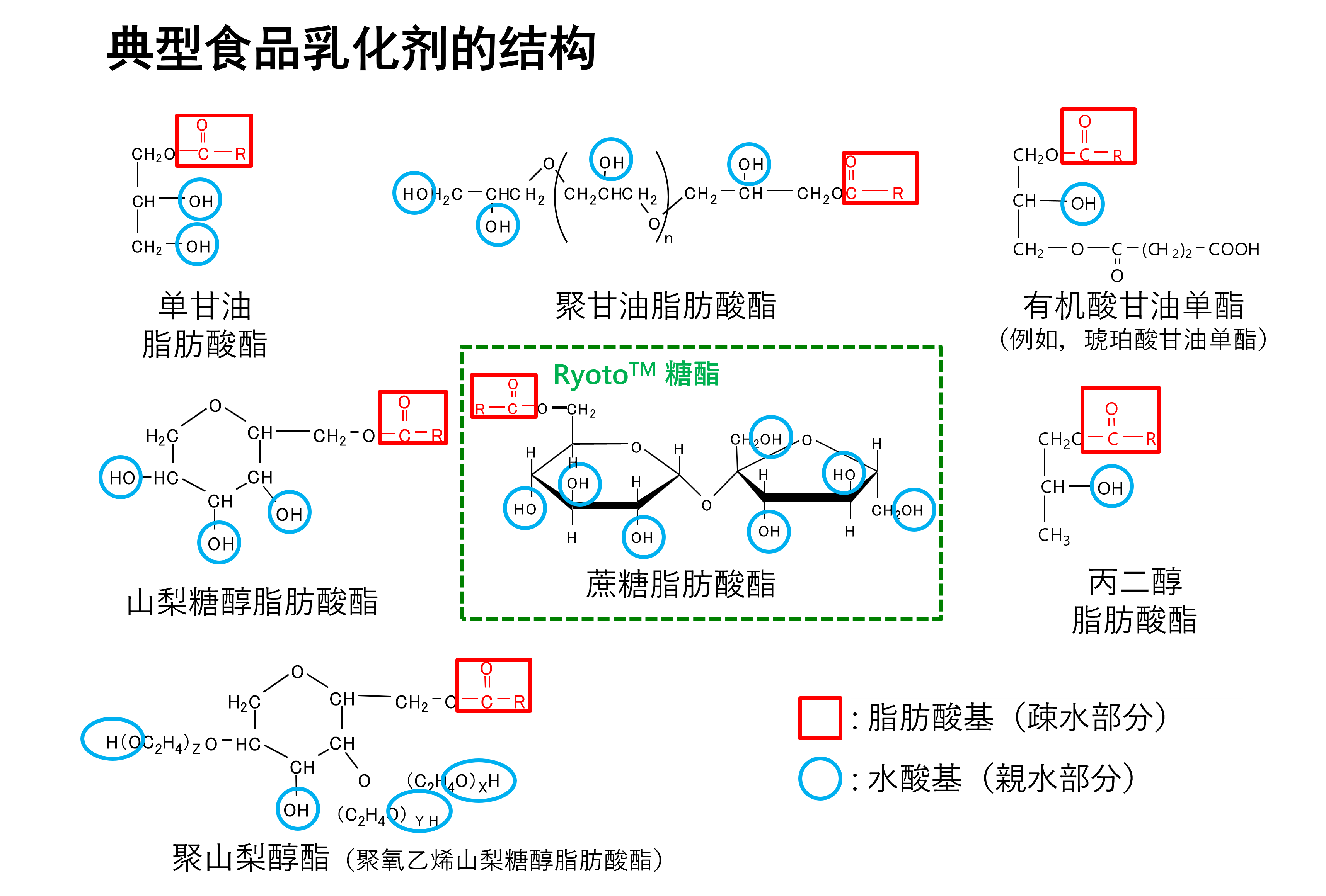 包括蔗糖脂肪酸酯和聚甘油脂肪酸酯在内,具有代表性的乳化剂如下:
