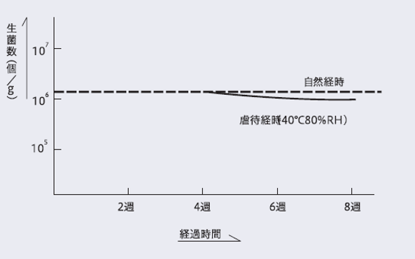 ①粉末ジュース中での安定性:温度40℃湿度80%という虐待条件下において4週間保持したところ、ほとんど生菌数に変化は生じませんでした。 さらに、自然経過では1年以上にわたって一定の菌数を保持します。