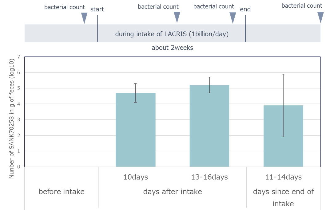 SANK70258の摂取を中止したあと2週間後でも便中から菌が検出されることから、腸内で増殖して滞在していると考えられます。