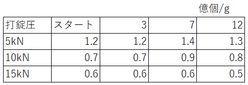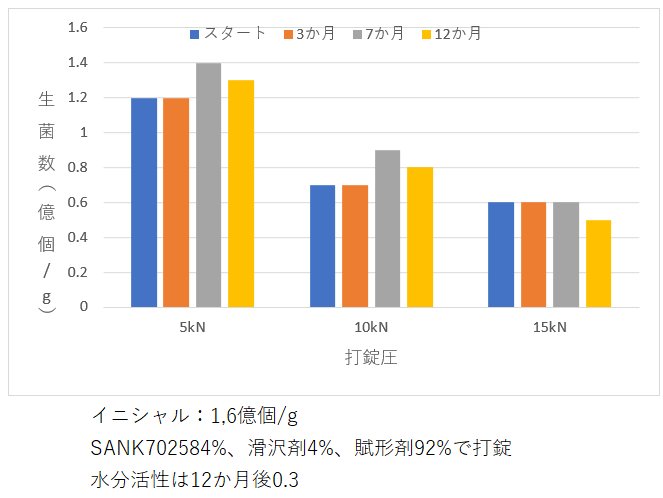 ②錠剤品での安定性:打錠圧15kNで打錠した際も、1年間経過後もほとんど生菌数に変化は生じませんでした。