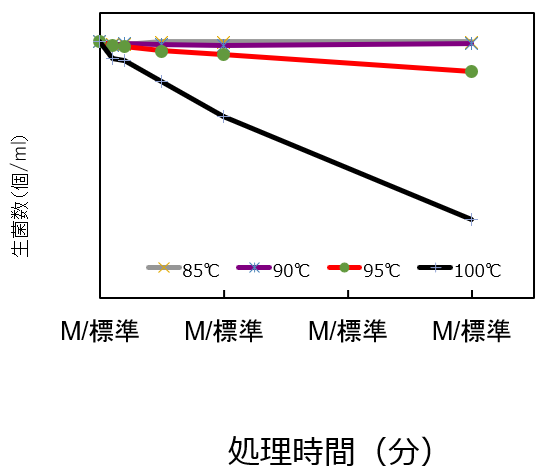 これにより、最終製品に添加した際に、その中での安定性が非常に高く、その結果様々なアプリケーションが開発されています。 耐熱性については、生理食塩水中で90℃30分間の加熱処理後も、菌数の低下はほとんどありませんでした。