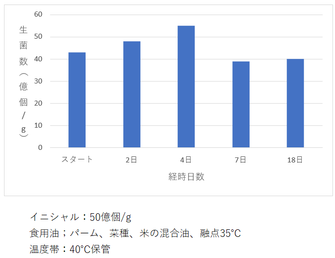 ③油中での安定性:植物油(40℃)で18日間保存した際も、ほとんど生菌数に変化は生じませんでした。