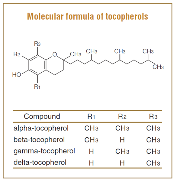 Vitamin E consists of two classes: tocopherols and tocotrienols. Each class has four homologs, referred to as α, β, γ, and δ. Since tocotrienols are found only in limited vegetable oils such as palm oil and rice bran oil, the term “vitamin E” generally refers to tocopherols.