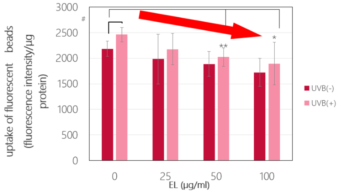 Vitamin E Linoleate Mixture suppressed the UVB-induced increase in uptake of pseudo-melanosomes (fluorescent beads) by HaCaT cells.
