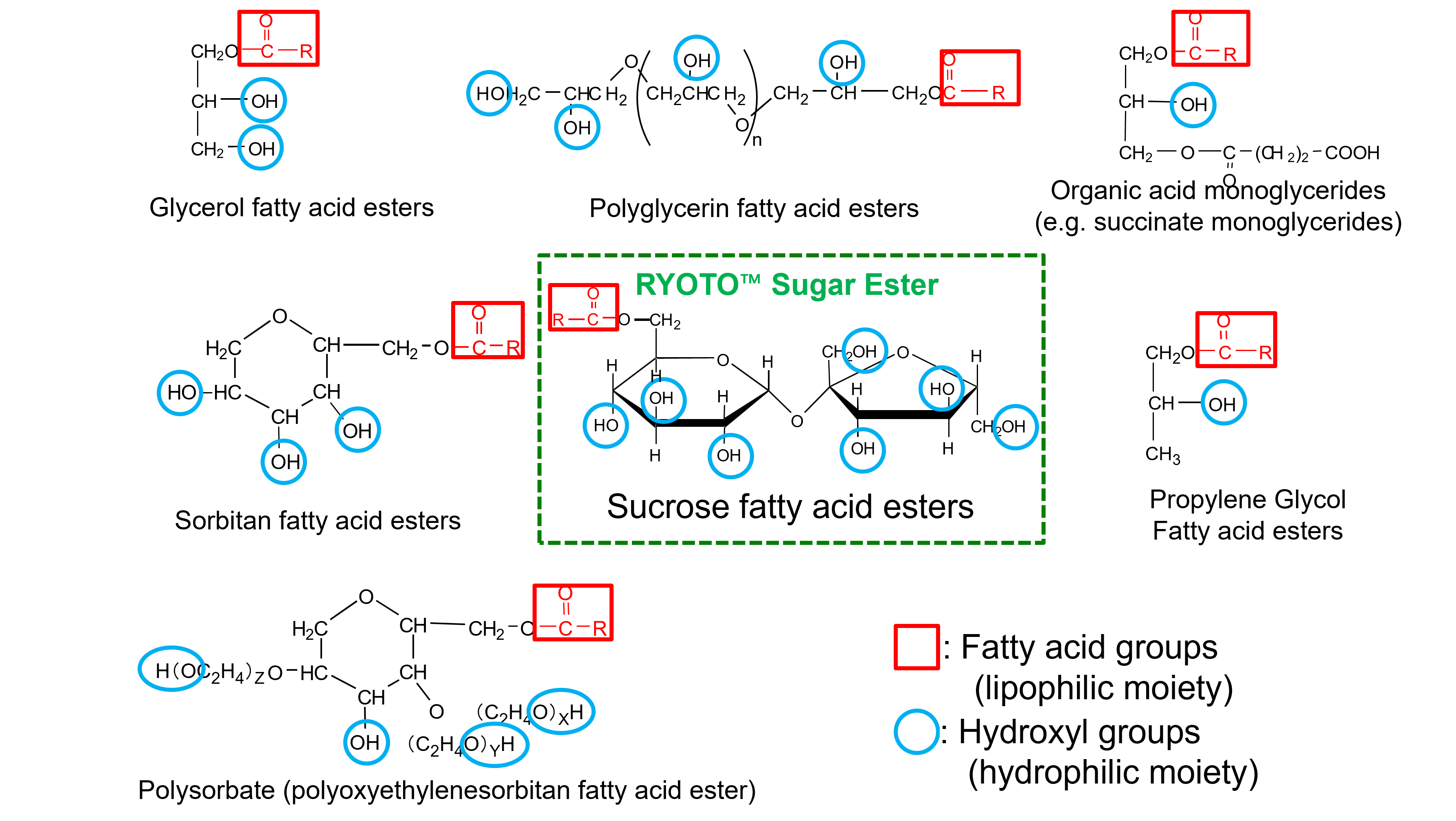 食品に用いられる乳化剤には様々な種類があり、それぞれ異なる化学構造と特性を有しています。親水基である多価アルコールと疎水基である脂肪酸で構成されており、多価アルコールの種類が変わることで様々な乳化剤となります。