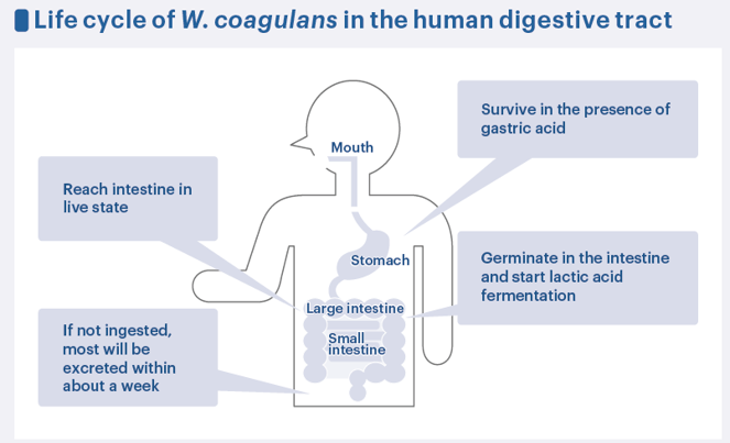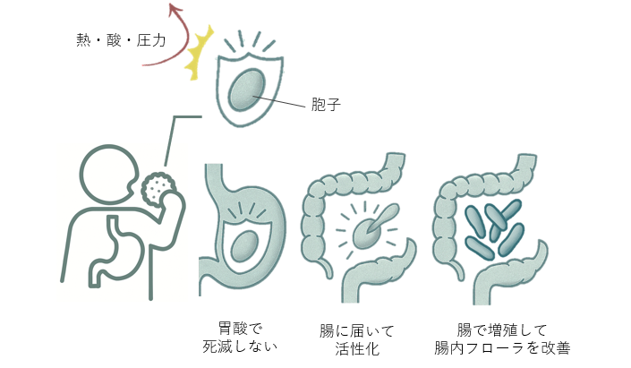 すなわち、熱や圧力がかかるような加工工程でも死滅せず、長期間保存しても菌数の減衰がありません。 加えて、口から入った有胞子性乳酸菌は胃酸や胆汁酸の刺激を受けて活性化し、増殖していくことで乳酸や有機酸を産生します。結果として腸内のpHを低下させることで、蠕動運動を活発化する。