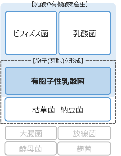 乳酸や有機酸を産生する微生物の代表例が、ビフィズス菌、乳酸菌、及び有胞子性乳酸菌です。 これらは、例えばヨーグルトやキムチなどの発酵食品に含まれています。 胞子(芽胞)と呼ばれる構造体を形成する微生物の代表例が、納豆菌、及び有胞子性乳酸菌です。 名前の通り、納豆に含まれる菌として知られています。 乳酸や有機酸を産生する/胞子(芽胞)を形成するといった2つの特徴を併せ持った微生物がいますね。それが有胞子性乳酸菌と呼ばれる微生物です。 世の中には様々な微生物があり、私たちの生活にとっても必要不可欠なものですが、その中でも有胞子性乳酸菌と呼ばれる微生物は大変珍しい特徴を持っています。 私たちは、このユニークな特徴を持つ微生物に注目し、以前より研究開発活動を続けてまいりました。