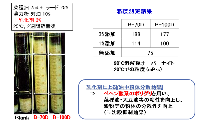 親水性のSWA-10DやSWA-20Dは、その水和力や耐酸性、耐塩性の高さを活かして、酸性乳飲料やソース、ドレッシング等の調味料の乳化安定に広く使用されています。同じく親水性のL-7DやM-7D、O-7Dなどは非常に高い親水性を活かして、香料や機能性成分の可溶化に応用されています。 一方で親油性のB-100DやB-70Dは、油脂の結晶化を促進したり、粘度を上昇させることができることから、チョコレートやチューブ調味料の物性改良などに使われます。 また、O-50Dは、油の界面張力を下げる機能を持ち、自己乳化性能を示すことから、機能性油や炊飯油の水への分散性向上に使われます。また、消泡機能もあるなど非常にユニークな特徴を持った乳化剤です。