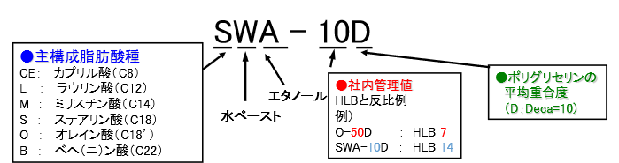 リョートー™ポリグリエステルは、脂肪酸の種類(ラウリン酸、ステアリン酸、オレイン酸など)とHLB値により、幅広い銘柄を取り揃えています。HLB値は親水性と親油性のバランスを示し、用途に応じた銘柄選択が可能です。