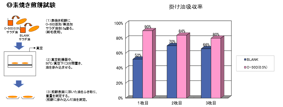 O-50Dをサラダ油に添加することで、煎餅への油の吸収速度が促進された。