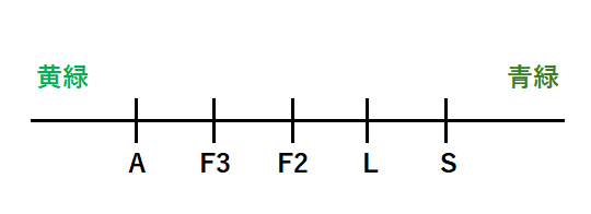 - 酸性側でS、Lは不安定、F2、F3、Aは比較的安定